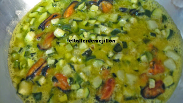 Batimos los cuatro huevos y añadimos lo que tenemos de las sartenes y mezclamos.