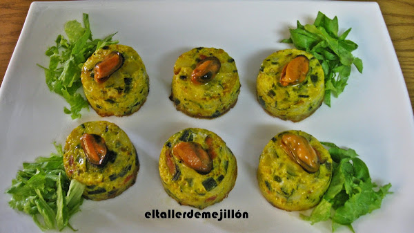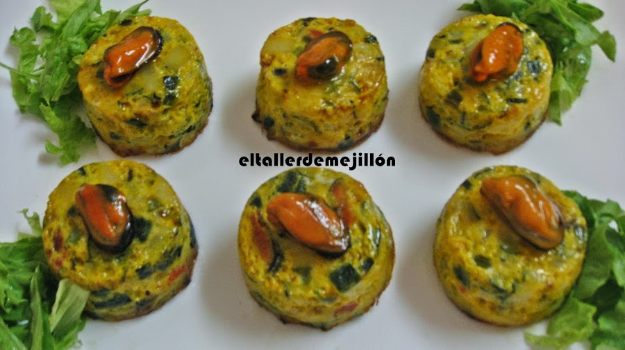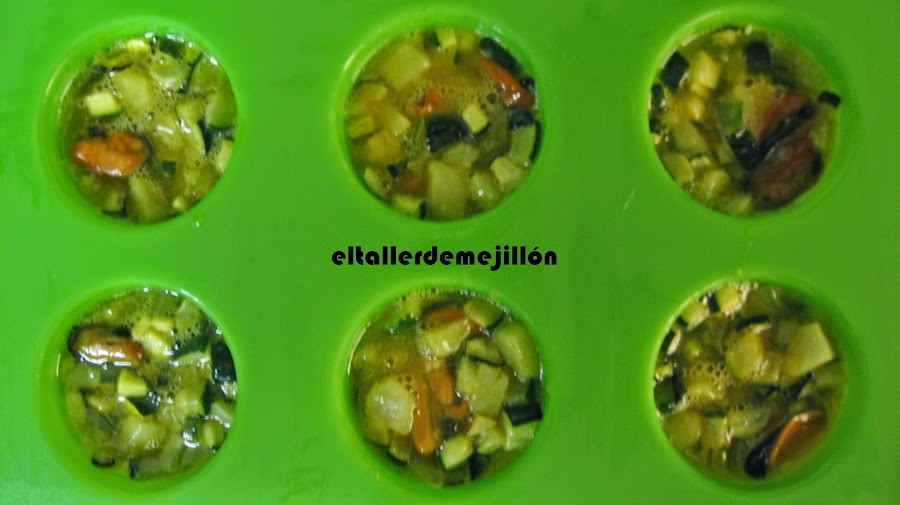 Para la elaboración de estas bonitas minitortillas hemos utilizado un molde de silicona que previamente hemos revestido con aceite y vamos añadiendo la mezcla.