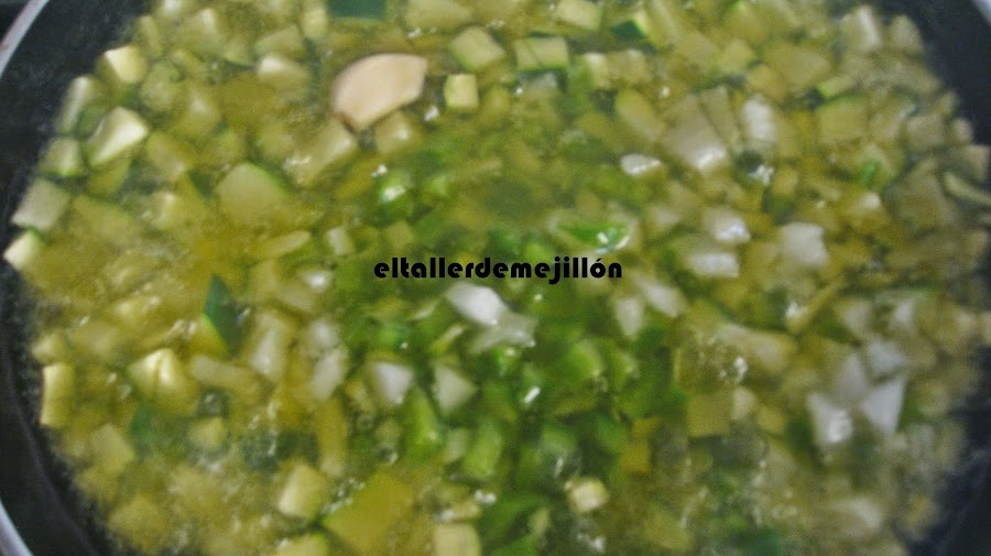 En cuanto vaya cogiendo color se vierte el pimiento verde cortado en dados y la cebolla picada muy fina. A mi me gusta añadir un diente de ajo porque le aporta un sabor especial. Cuando esté listo lo añadimos.