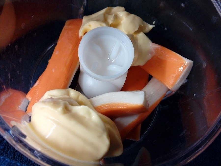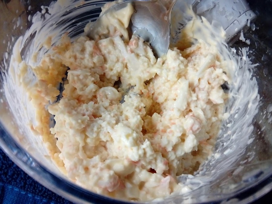 Si la hacemos nosotros, tan sólo hay que picar palitos de cangrejo con mahonesa. Yo puse 6 palitos y dos cucharadas de mahonesa.