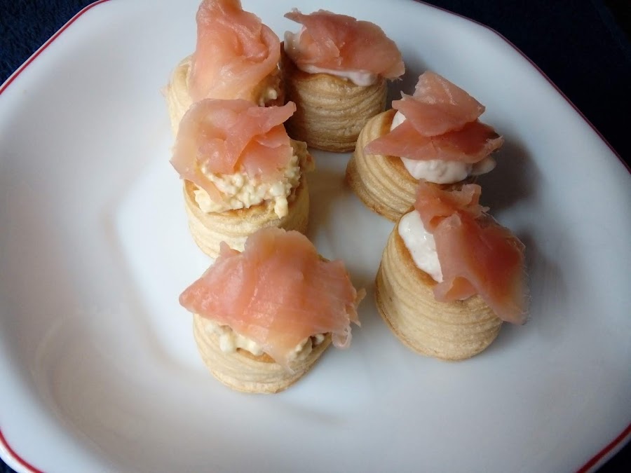 Rellenamos los minivolovanes generosamente de ensalada y cubrimos con salmón ahumado.
