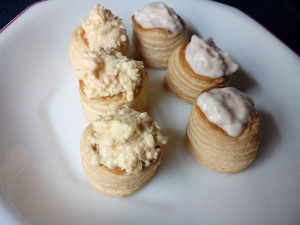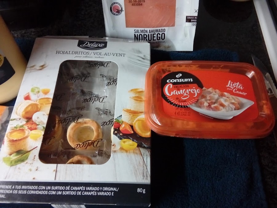 Con la opción exprés sólo necesitamos tres ingredientes: minivolovanes, ensalada de cangrejo y salmón ahumado.