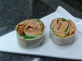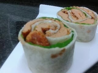 Extendemos papel film o de aluminio sobre la encimera y ponemos una tortita de pan. Untamos de mahonesa. Cubrimos con la lechuga y con los "crepes" de sardina y pimiento, pero sólo la mitad por donde empezaremos a enrollar, porque se nos irá moviendo hasta el final.