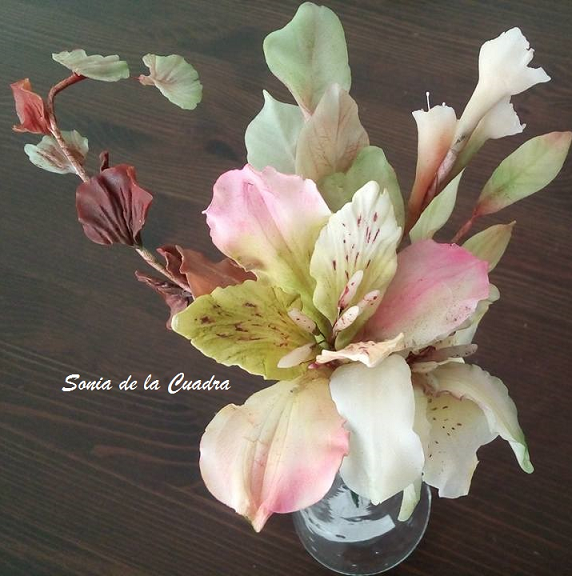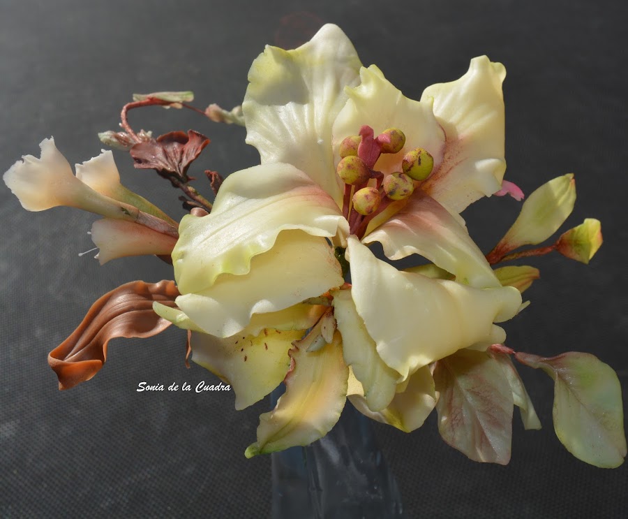 Son flores hechas con chocolate de modelar marca BEAU, que es una maravilla para trabajar con él. El Chocolate es un material muy noble para trabajar, y, aunque requiere una temperatura adecuada de ambiente y de las manos para trabajarlo, luego el resultado es expectacular. A mi me gusta mucho más que el azúcar.