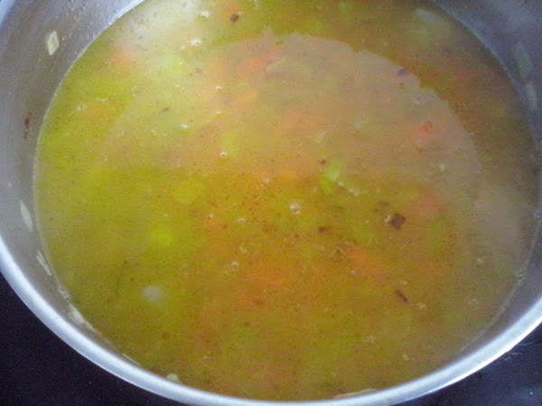 cuando las verduras empiecen a tomar color, añadimos el sal, un par de litros de agua y el zumo de las dos naranjas.