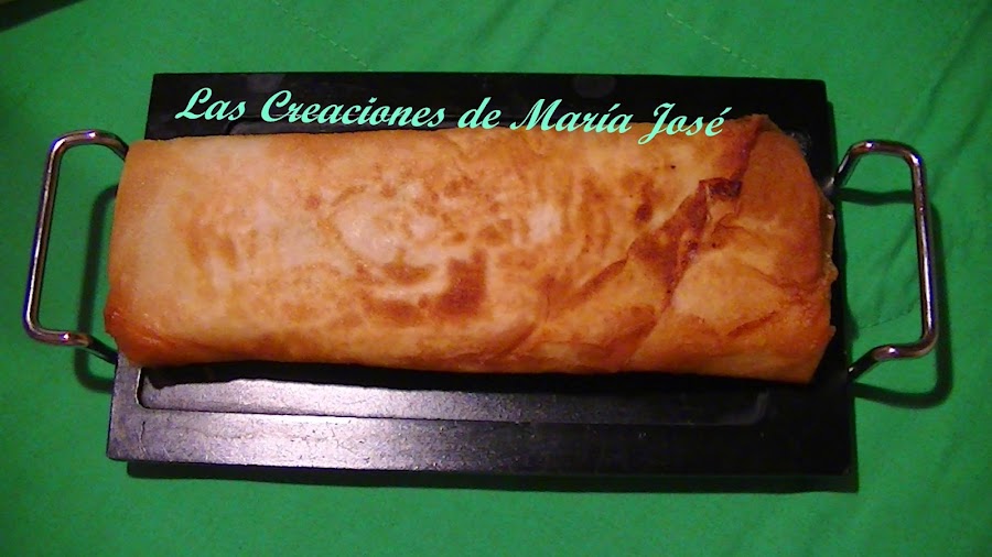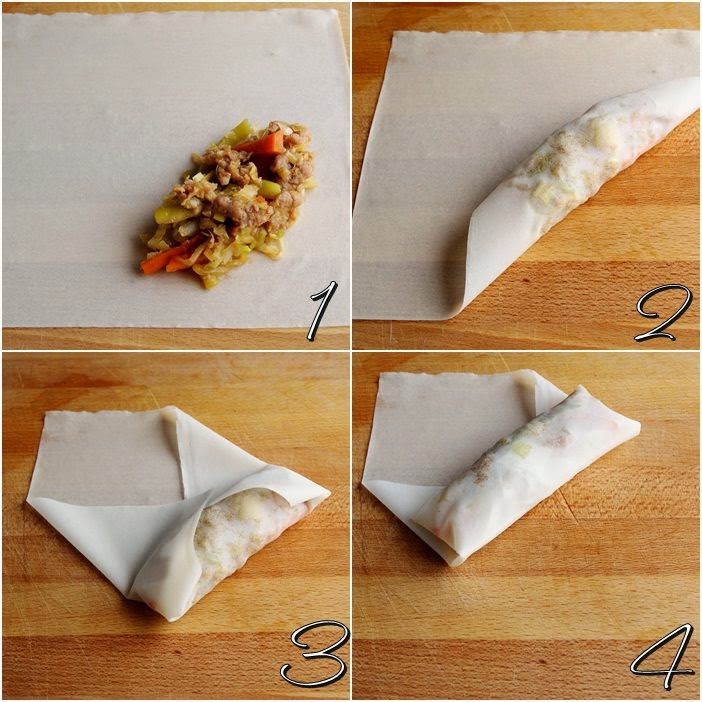 Cortar las verduritas en juliana (en tiras). Rehogarlas con un poco de aceite de oliva, la sal y una pizca de jengibre. De que este todo bien rehogado, coger 2 laminas de pasta filo juntas y echar un pulladito de verduras en un lado, doblarlo como viene en la imagen de abajo. Yo hice 4 rollitos y los acompañe con salsa agridulce.
