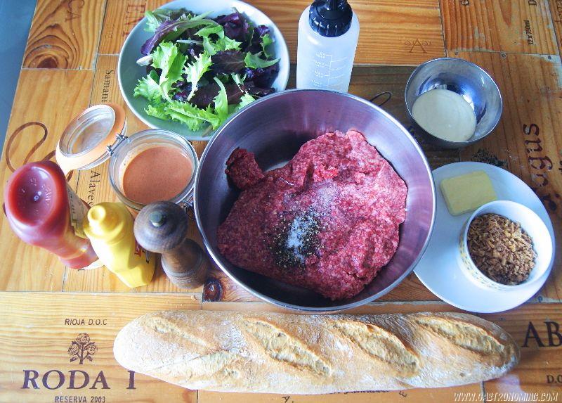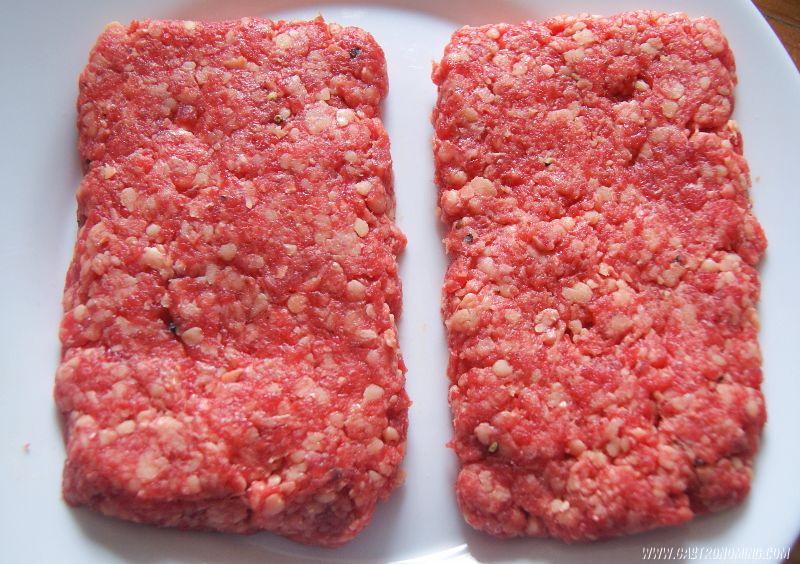 1. Sazonamos la carne picada con sal y pimienta, integramos bien y, o bien damos formas de hamburguesas alargadas o rectangulares y adoptamos con la carne la forma de la baguette, que es lo suyo ¿No? Haremos 4 hamburguesas de 130 gramos cada una.2. En una sartén muy caliente con el aceite de oliva cocinamos nuestras “hamburguesas”.
