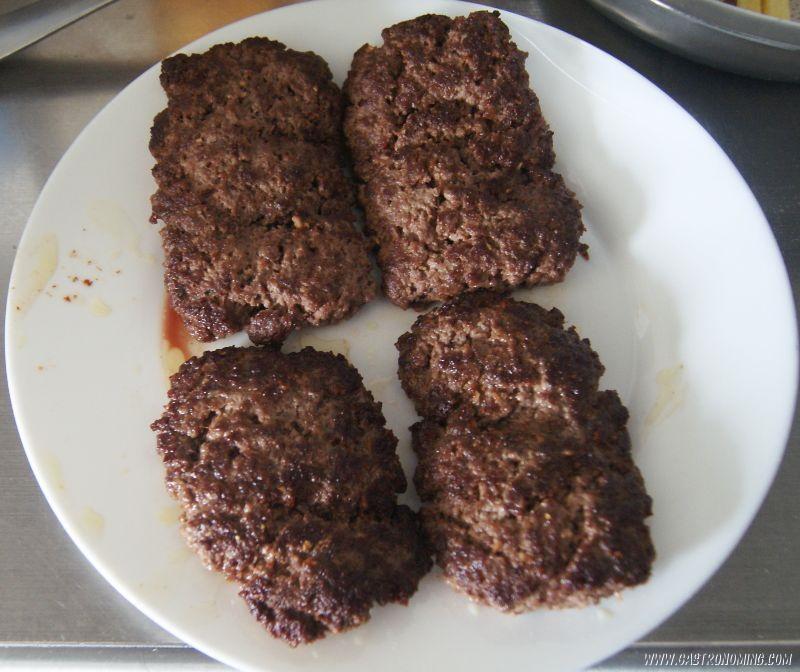 Sazonamos la carne picada con sal y pimienta, integramos bien y, o bien damos formas de hamburguesas alargadas o rectangulares y adoptamos con la carne la forma de la baguette, que es lo suyo ¿No? Haremos 4 hamburguesas de 130 gramos cada una.En una sartén muy caliente con el aceite de oliva cocinamos nuestras “hamburguesas”.
