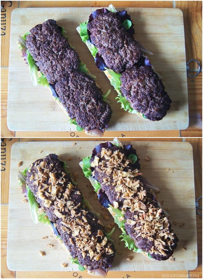 Encima agregamos las hojas de lechuga fresca, seguido de las “hamburguesas”, por encima la cebolla crujiente, cubrimos todo con una gran cantidad de patatas fritas y coronamos con mucha salsa Andalouse.