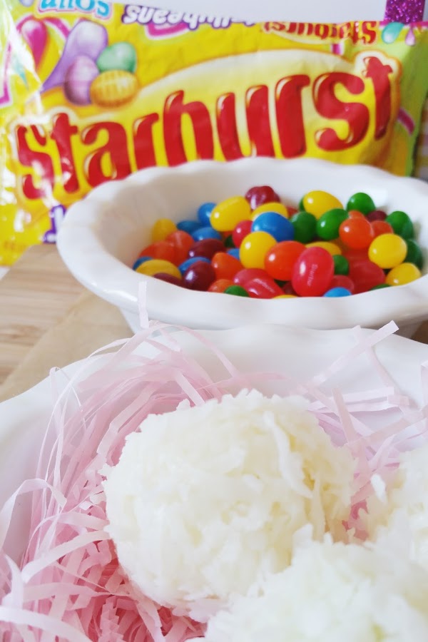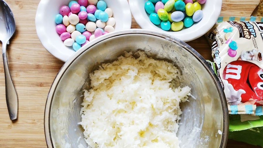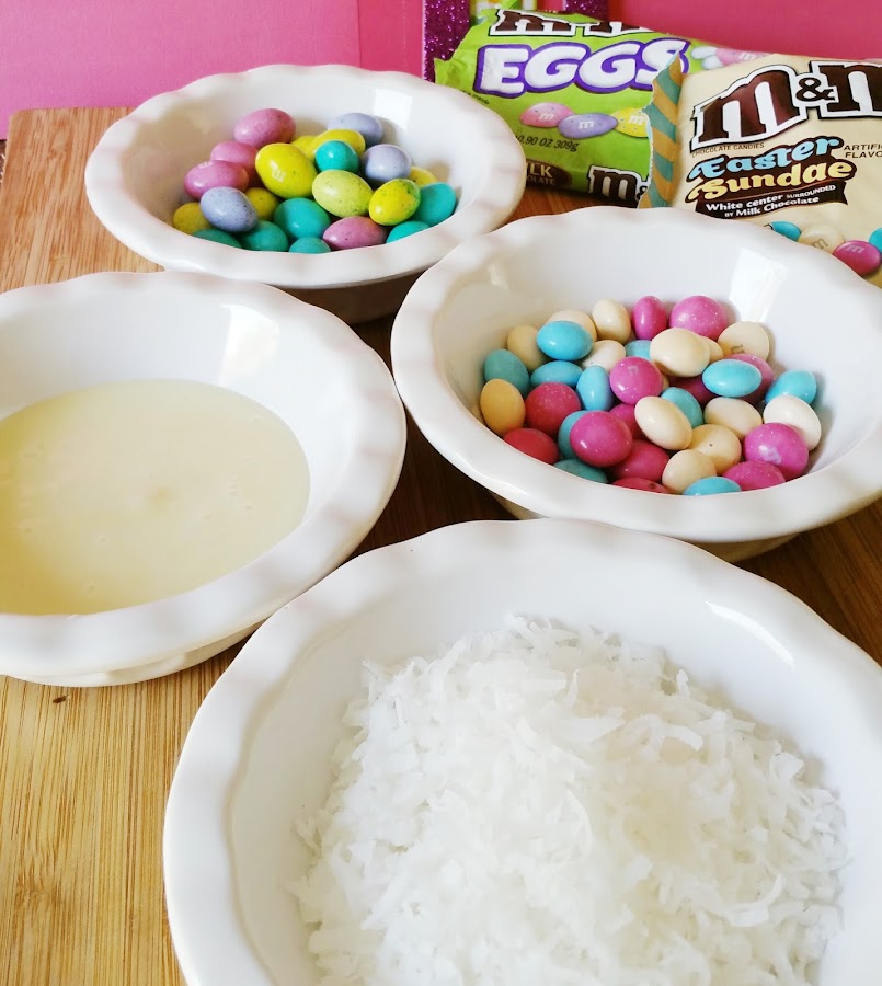 Solo necesitaremos 4 ingredientes. 1 lata de Leche condensada, 1 bolsa de coco rallado, 1 bolsa de M&Ms® Easter Sundae flavor (este sabor lo encuentras en Walmart por un tiempo limitado) y M&Ms® varieties. Opcional- una bolsa de Starburst® Jellybeans para decorar.