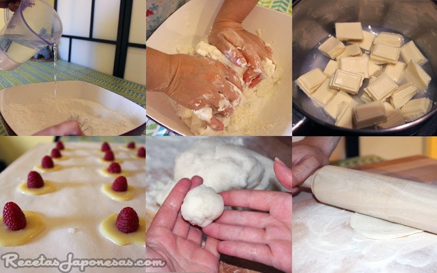 14. Coge cada pieza y colócala con la frambuesa hacia abajo cobre la masa de mochi. Cierra cada mochi formando una bola. Repite el mismo proceso 12 veces.