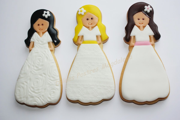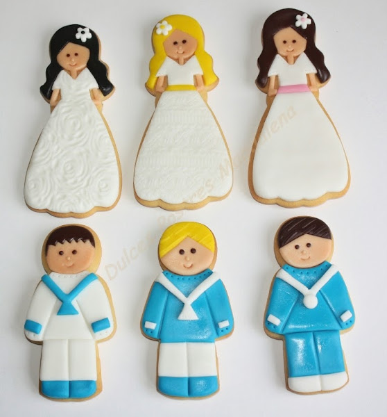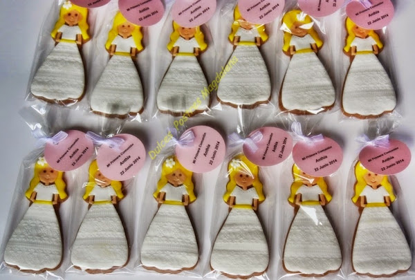 Para hacer estas galletas de comunión he utilizado nuestra receta de masa para galletas decoradas, los cortadores nº 4 (pelo suelto) y nº 102 (pelo recogido) y nuestro modelo nº 221 en papel de azúcar. Tenemos otros muchos modelos de niños y niñas de primera comunión para galletas: podéis verlos aquí. Además he utilizado unas cajas para galletas decoradas que espero que os gusten tanto como a mí ...