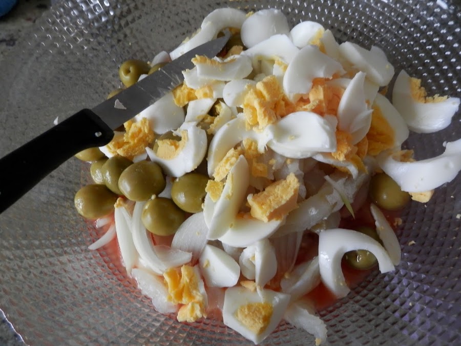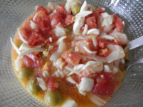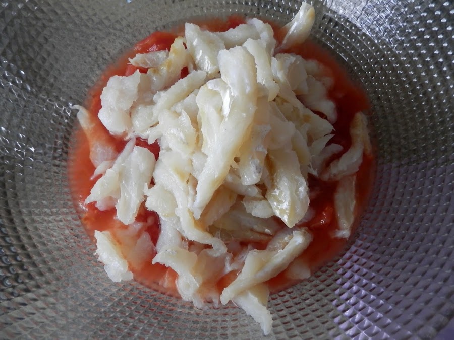 En un bol, ponemos el tomate y añadimos en tiras el bacalao.