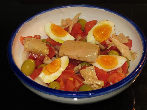 Mientras el huevo se ha estado cociendo habéis pelado los tomates y los habéis cortado en trozos, así como la cebolla. Lo añadís todo a una ensaladera y echáis el bonito desmigado y las aceitunas. Ponéis el huevo duro decorando y le echáis por encima la sal y el aceite de oliva y ya está listo para degustar.