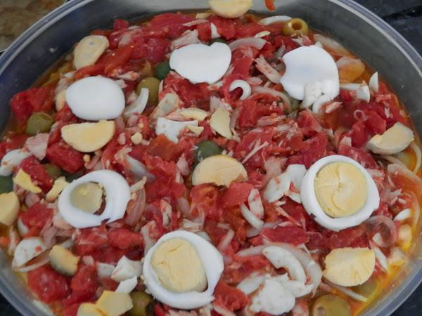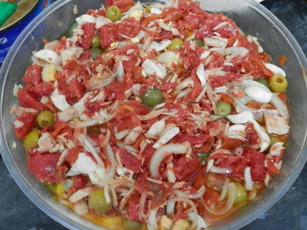 Cuando ya está todo mezclado con cuidado para que el huevo no se desmorone demasiado,ponemos las aceitunas y añadiremos el aceite de oliva y la sal.