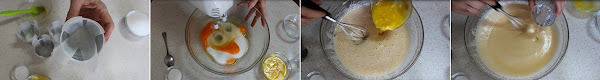 En un bol ponemos los huevos y el azúcar y los batimos con las varillas hasta que doblen su volumen, seguimos batiendo hasta conseguir una crema espumosa.