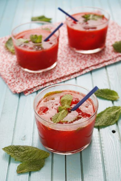Romper con las manos las ramitas de hierbabuena y distribuirlas entre los vasos. Picar el hielo con la thermomix, dándole unos toques de turbo. Añadir el hielo a los vasos y repartir entre ellos la mezcla de fresas. Servir en vaso bajo con una pajita.