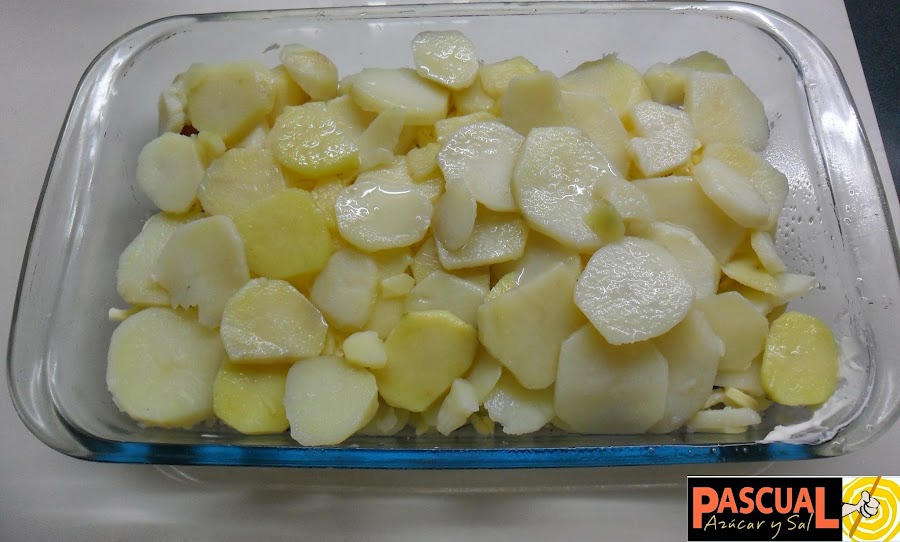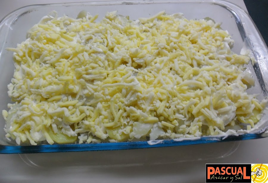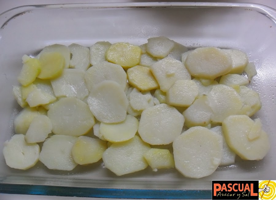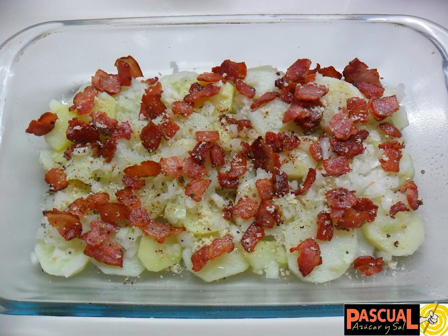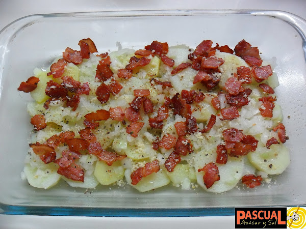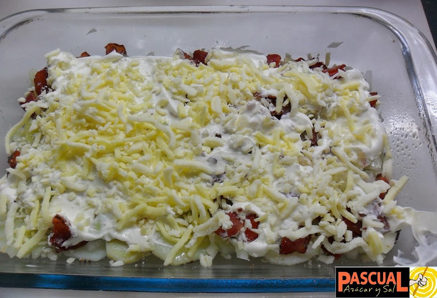 8- Ponga una capa de rodajas de papa, encima tocineta, cebolla, un poco de la salsa y unos cubitos de margarina una parte del queso mozzarella.