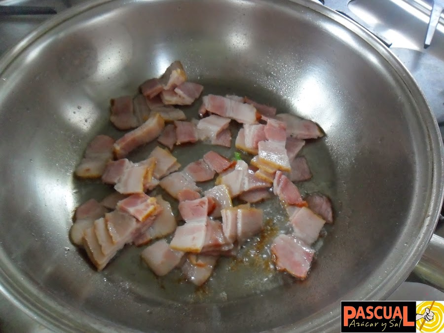 4-Ponga a freír la tocineta en un sartén, y cuando este lista sáquela aparte.