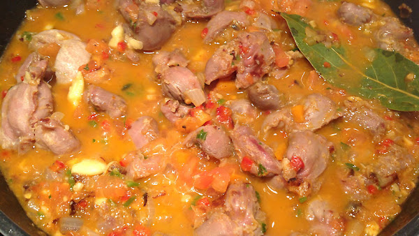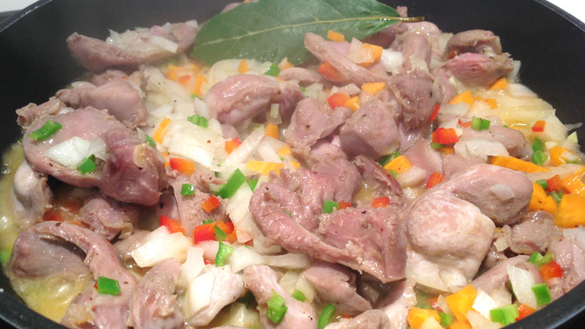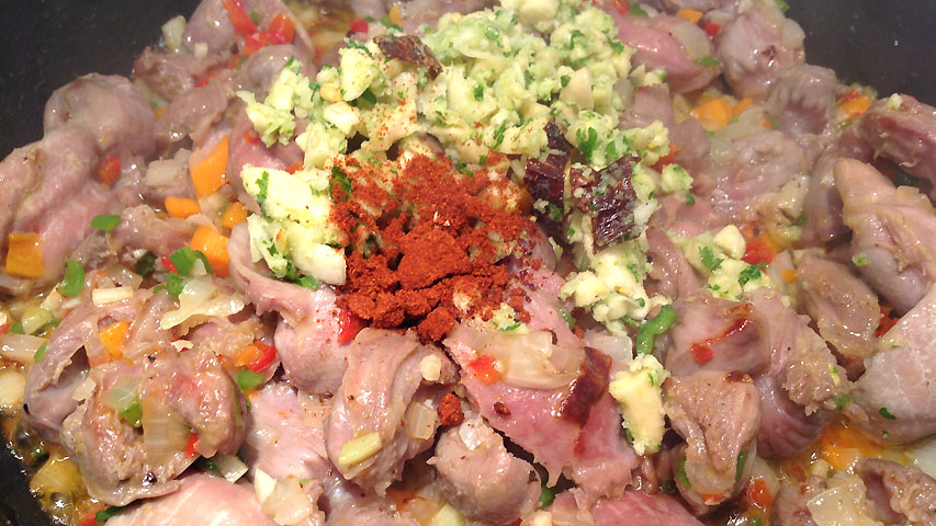 Cuando la verdura esté sofrita vierte el majado sobre las mollejas así como una cucharadita de pimentón dulce.