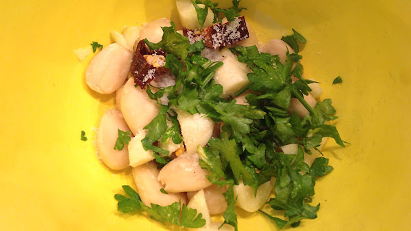 En el mortero introduce las almendras, el otro ajo y un poco de perejil hasta moler bien.