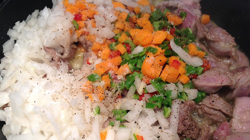 Incorpora la verdura bien picada: ajo, pimiento verde y rojo, zanahoria y cebolla. Salpimienta.