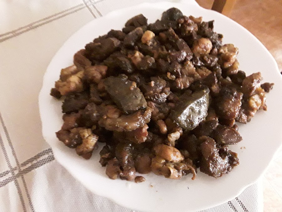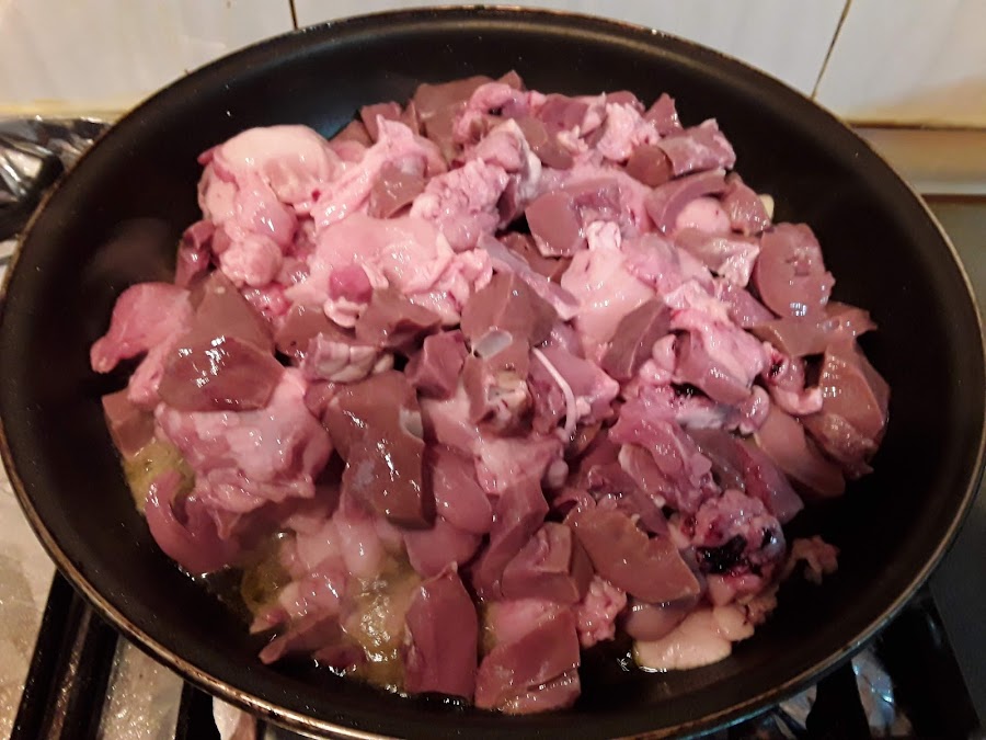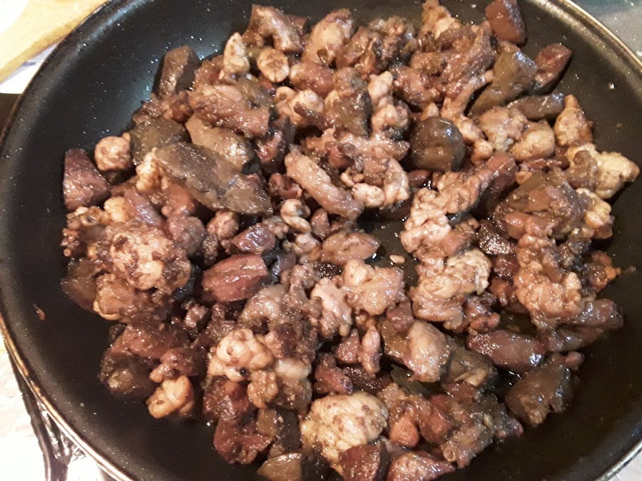 volvemos a remover y ya procederemos a poner las mollejas e hígados, cogeremos a puñados de dentro del bol dejado que se escurra el agua en el bol iremos pasando la carne a la sartén,