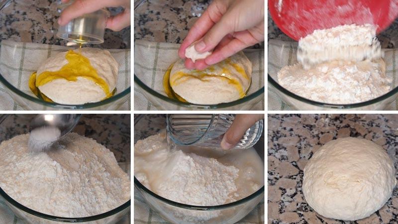 Para preparar la masa final del pan vamos a colocar el fermento previo en un recipiente amplio y limpio. Añadimos ahora el aceite de oliva virgen extra, aunque en su lugar puedes usar manteca de cerdo que suele usarse en la receta original.Ponemos también la levadura fresca de panadero desmenuzada, la harina de trigo, sal al gusto (con una cucharada sopera estará bien) y por último el agua. Mezclamos todos los ingredientes, mejor con las manos, amasamos y formamos una bola.