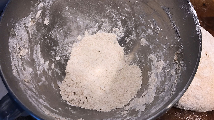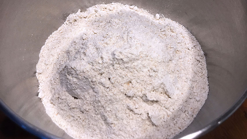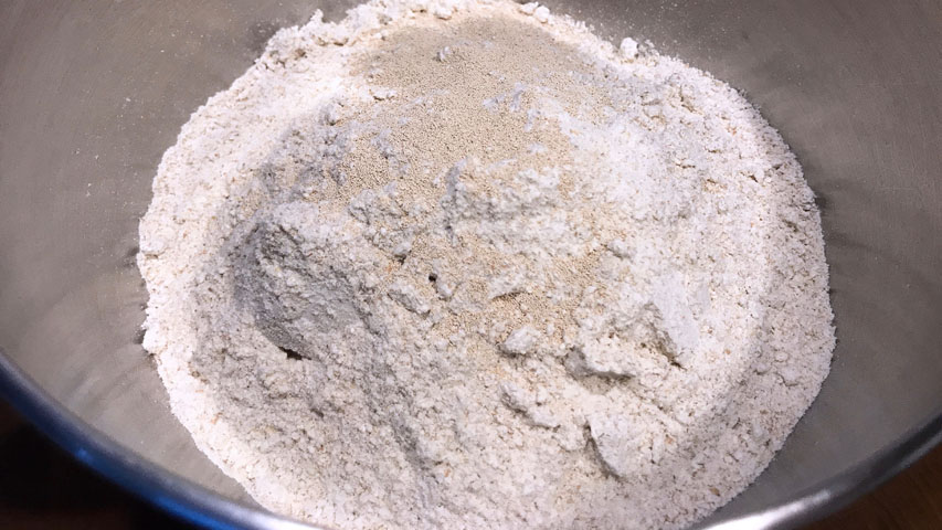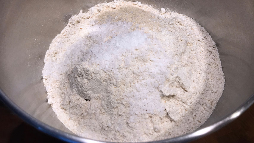 Mezcla la harina de trigo integral con la levadura, la sal y el agua.