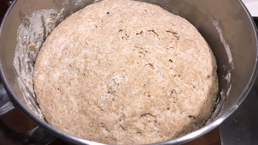 Pon la bola de masa en un bol y tapa con un trapo o un plástico y deja que leve hasta duplicar su volumen. Yo la dejo unas 2 horas.