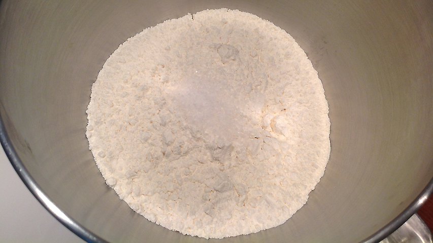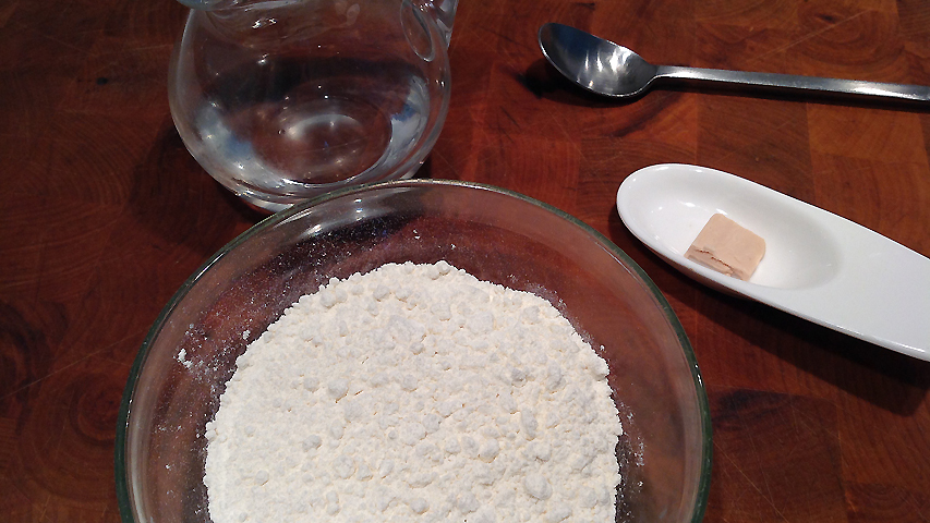 Comienzo a preparar la masa definitiva disolviendo la levadura en el agua por un lado y mezclando la harina con la sal por otro.