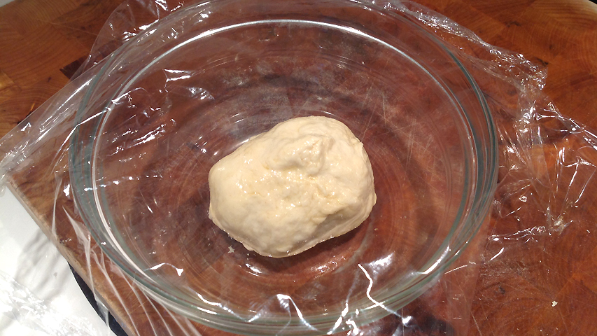 Embadurno la masita con unas gotas de aceite de oliva y tapo con papel film. Ahora dos horas de fermentación y a la nevera hasta mañana.