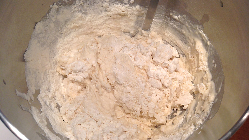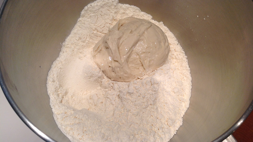 Añade el prefermento (troceado) y mezcla con la harina (ayúdate de la harina porque el prefermento es muy pegajoso).