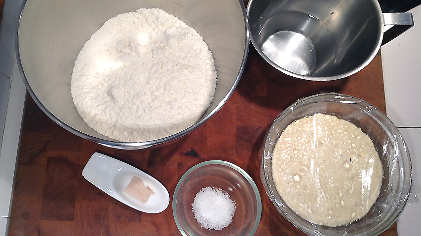 Los ingredientes de la masa definitiva: el prefermento (serán unos 150 gr más o menos), la harina (500 gr), el agua (300 gr), la levadura (4 gr) y la sal (10 gr)