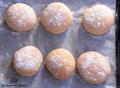 Una vez que la masa haya doblado su volumen , espolvoreamos la encimera con un poco de harina. Vertemos la masa encima y hacemos un rulo con ella. Cortaremos los molletes en porciones de 90-100gr y los iremos colocando sobre la bandeja de horno, a la que habremos puesto previamente papel de horno.