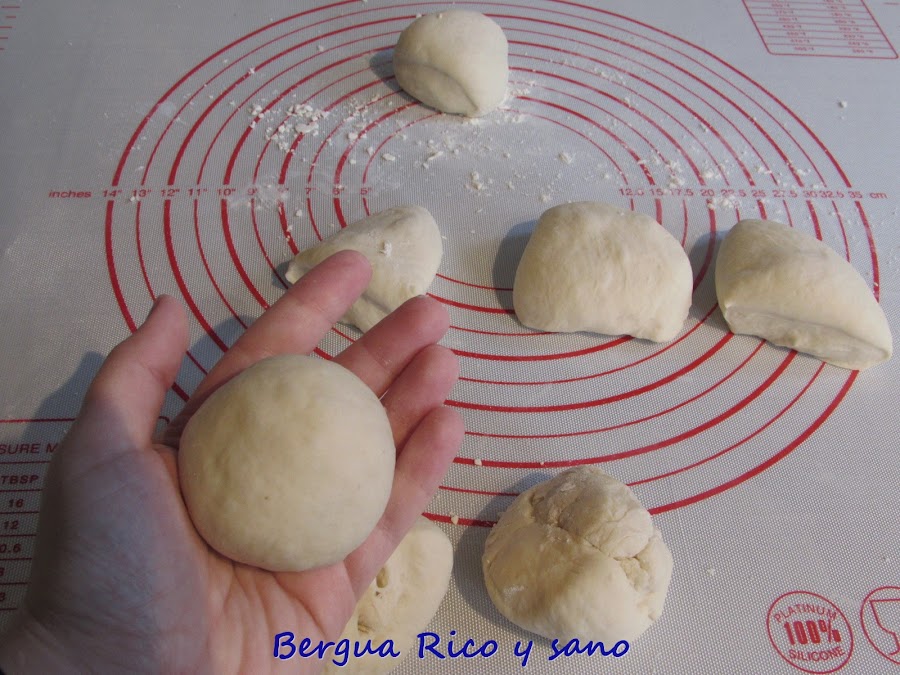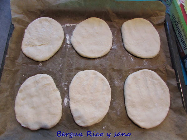 5. Boleamos cada parte, las aplanamos un poco con la palma de la mano (les damos 1,5-2,5 cm) y les damos forma ligeramente ovalada. Espolvoreamos con una pizca de harina y les damos 40 minutos de reposo, tapados para que no se sequen.