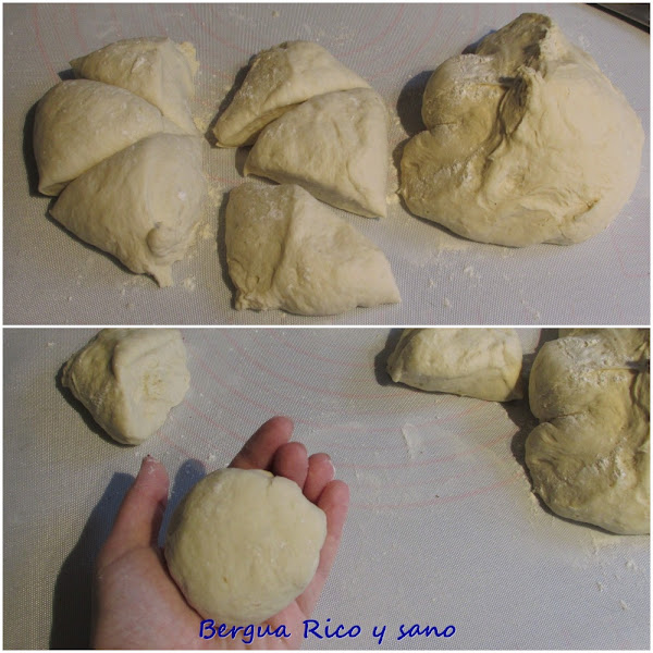 6. Boleamos de nuevo para desgasificar y dividimos primero en dos mitades; boleamos cada mitad y las dividimos en cuatro; al final tendrás 8 molletes. Si los pesas, que sean de unos 75 g cada uno, y si no, pues a ojo, más o menos del mismo tamaño.