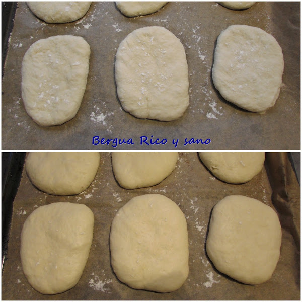 8. Ahora las estiramos y aplanamos con la mano. Los molletes son ovalados, no redondos. Les damos un grosor de unos 1,5-2,5 cm, los colocamos con harina por arriba y por abajo sobre papel de horno en la bandeja del horno, cubrimos para que no se sequen y les damos la última fase de levado; 30-60 minutos para que vuelvan a doblar en volumen.