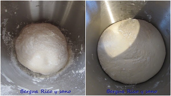 5. Después le damos un minuto más de meneo (amasado) sobre la mesa enharinada, boleamos y dejamos levar en un cuenco amplio sobre el fondo enharinado y con harina espolvoreada también sobre la masa. Tiene que doblar su volumen, y eso puede llevar 1-2 horas; según la temperatura que haga. Lo mejor es dejarla tranquila, tapada, dentro del horno apagado, para que no hayan corrientes ni cambios de temperatura.
