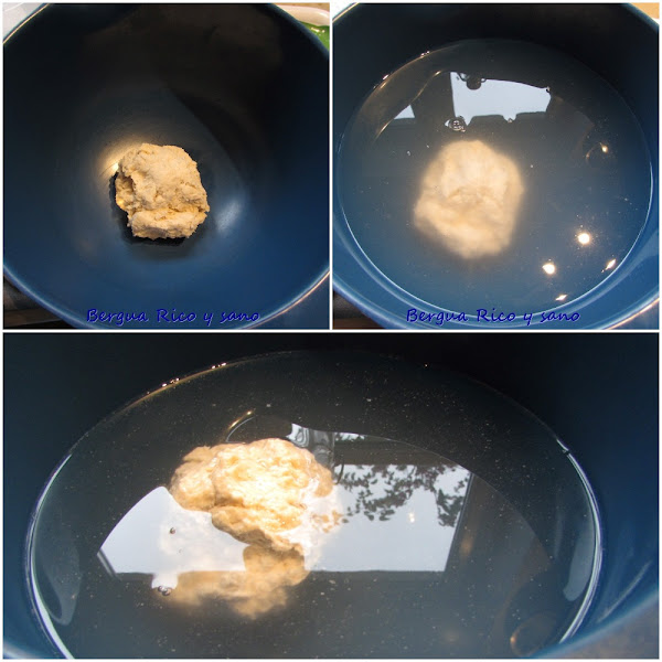 2. Metemos el prefermento en un cuenco de agua tibia (no caliente); tiene que haber suficiente agua para cubrir la bola y más. Cuando la bola suba a la superficie, está listo. No pasa nada si se rompe en dos partes.