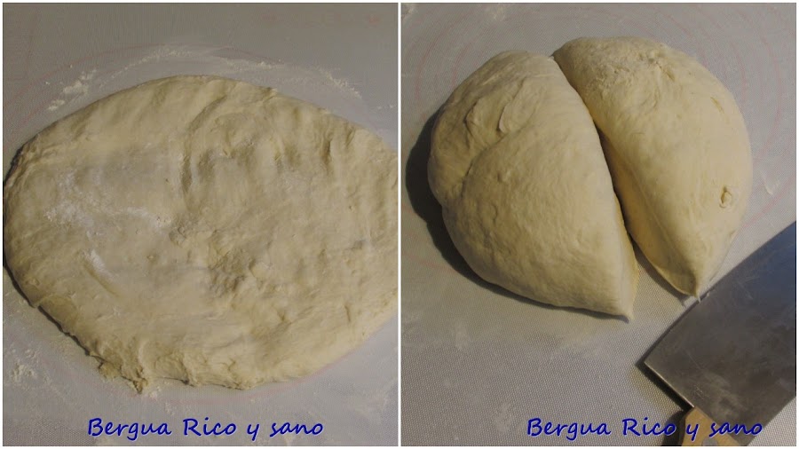 4. Sacamos la masa a la encimera enharinada y manejamos y aplanamos la masa para desgasificar. Ahora la boleamos y cortamos por la mitad.