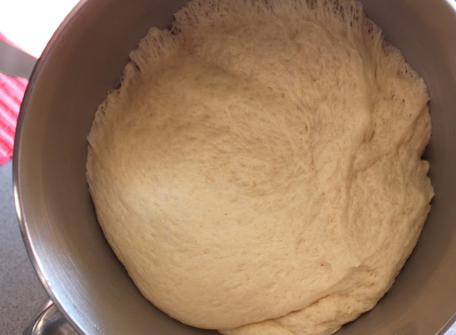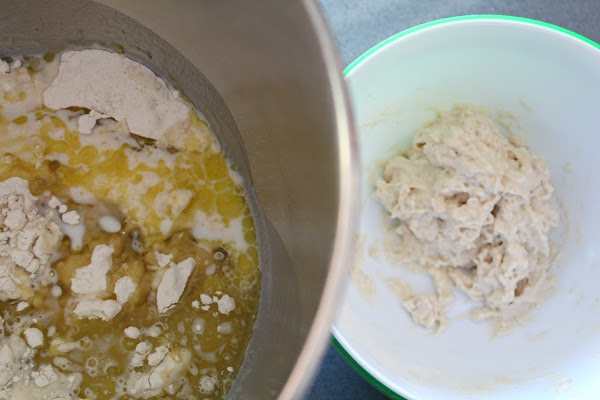 En otro bol o en la amasadora, ponemos ya todos los ingredientes, junto con el prefermento ya activo.