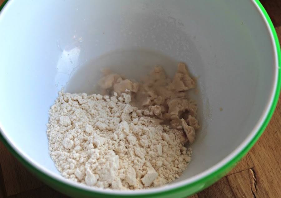 Deshacemos la levadura en el agua, añadimos el azucar y una cucharada de harina. Mezclamos bien y dejamos reposar, hasta que burbujee.