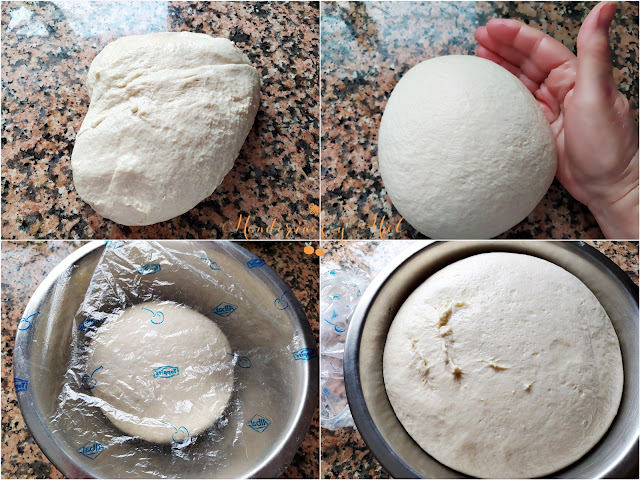 Haz una bola, pon la masa en el bol y tápala, deja que fermente durante 1 hora y media o 2 horas.