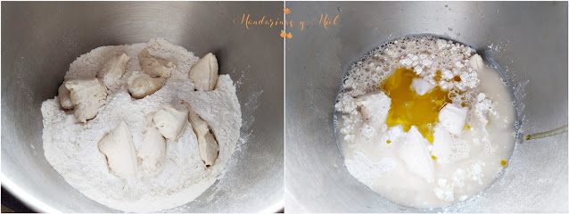 Pon en un bol grande la harina, el prefermento cortado en trocitos, el agua con la levadura, el aceite y la sal.