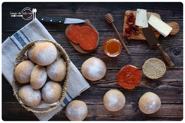 Estos molletes se pueden comer con aceite y sal al estilo andaluz o, como en nuestra propuesta, rellenarlos de sobrasada y miel o bien con queso brie y tomates deshidratados en aceite.