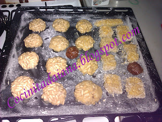 5) Con la masa que hemos hecho, empezamos a hacer bolitas y las rebosamos primero pasandolas por la clara de huevo y después por los piñones o por las almendras picadas. Las irémos colocando en una bandeja para horno cubierta de papel aluminio y espolvoreada con harina. Yo lo que hice fue enmantecar y enharinar una bandeja para horno y colocarlos ahí para cocinarlos.