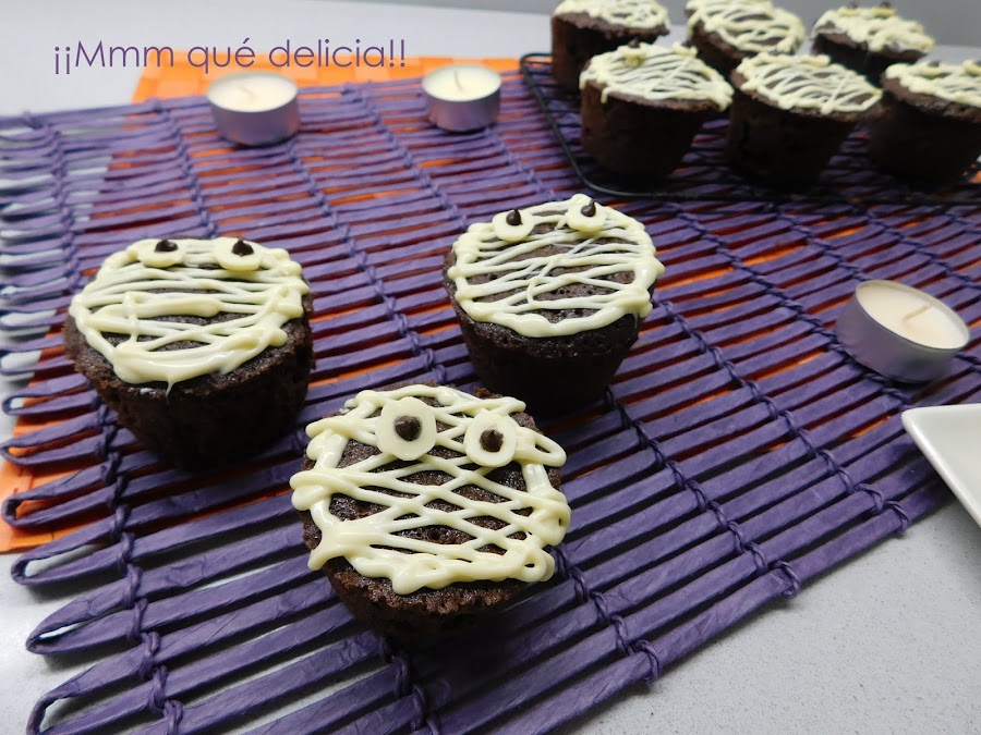 Una vez desmoldados los bizcochitos los podemos decorar como momias derritiendo 170 gr. de chocolate blanco y pintándolos con ayuda de una manga pastelera de boquilla fina. Para los ojos podemos usar lacasitos o simplemente dibujarlos con chocolate blanco y un poquito de chocolate negro y ¡¡YA ESTÁ LISTOS PARA TOMAR!!
