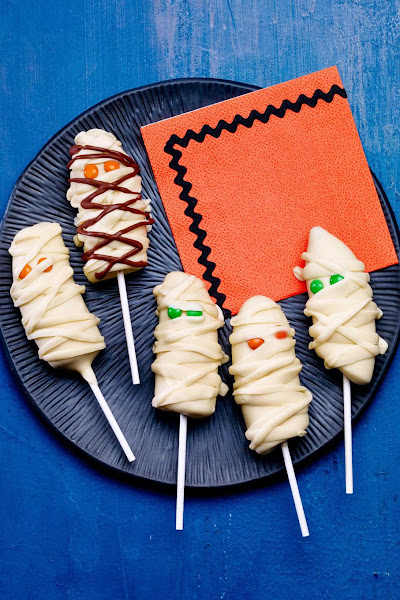 Derrite el chocolate blanco restante en el microondas y llena una bolsa o manga pastelera con una punta de boquilla pequeña y redonda. PDibuja zigzags sobre el plátano para formar vendas. R. Enfría o congela hasta que esté listo para servir.