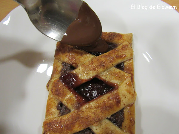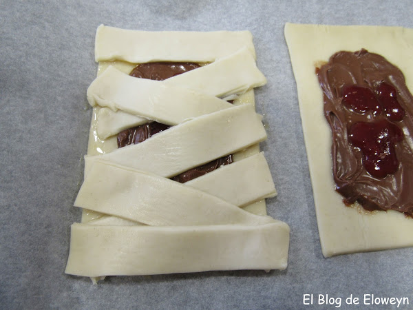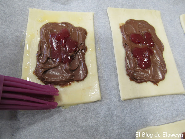 Batimos el huevo, y con un pincel, pintamos los bordes del rectángulo, con cuidado de no manchar de Nocilla los bordes.